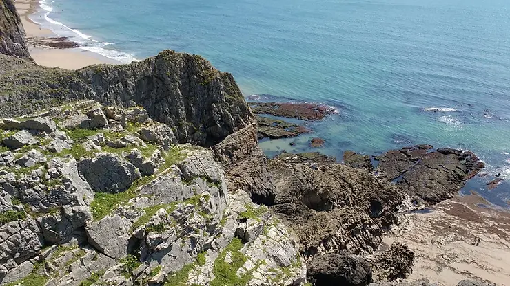The bay is steeped in history having once been a haven for local smugglers, there is a nearby gully called Graves End which is marked by a circle of limestone rocks, so called due to the burial of several people who were found dead on the bay following a ship called The Caesar ending up wrecked upon the shore in 1760. The Caesar was an Admiralty tender ship on a recruitment mission, when rough sea conditions on the channel drove it against the headland of Pwlldu. Although a few officers of the ship escaped with their lives, around 90 press ganged men all imprisoned below deck on the ship, were not so lucky. Later, during the 19th century, it was a centre for Limestone quarrying and its these rocks that give it it’s unique topography. Near the top of the cliff on the west side is the now overgrown remnants of one of the quarries which is reportedly a fascinating place to explore if you can find a way to access it. There are two cottages situated on the Western side of the beach known as Seven Slades, these cottages were originally inns called “The Ship and The Beaufort”.